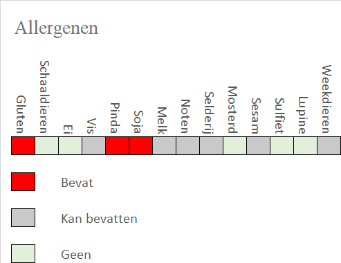 PINDA, TARWEbloem, Suiker, maiszetmeel, Maismeel, Palm olie (RSPO), Zout, SOJA saus poeder (TARWE, SOJA, maltodextrine, zout, koji, kleurstof (E150c)), Seasoning (maltodextrine, verdikkingsmiddel (E414), mosterdaroma, palmolie, anti-oxidant (E392)), Rijsmiddel (E500), Aardappelzetmeel, Voedingszuur (E330), Kleurstof (E141), Wasabi